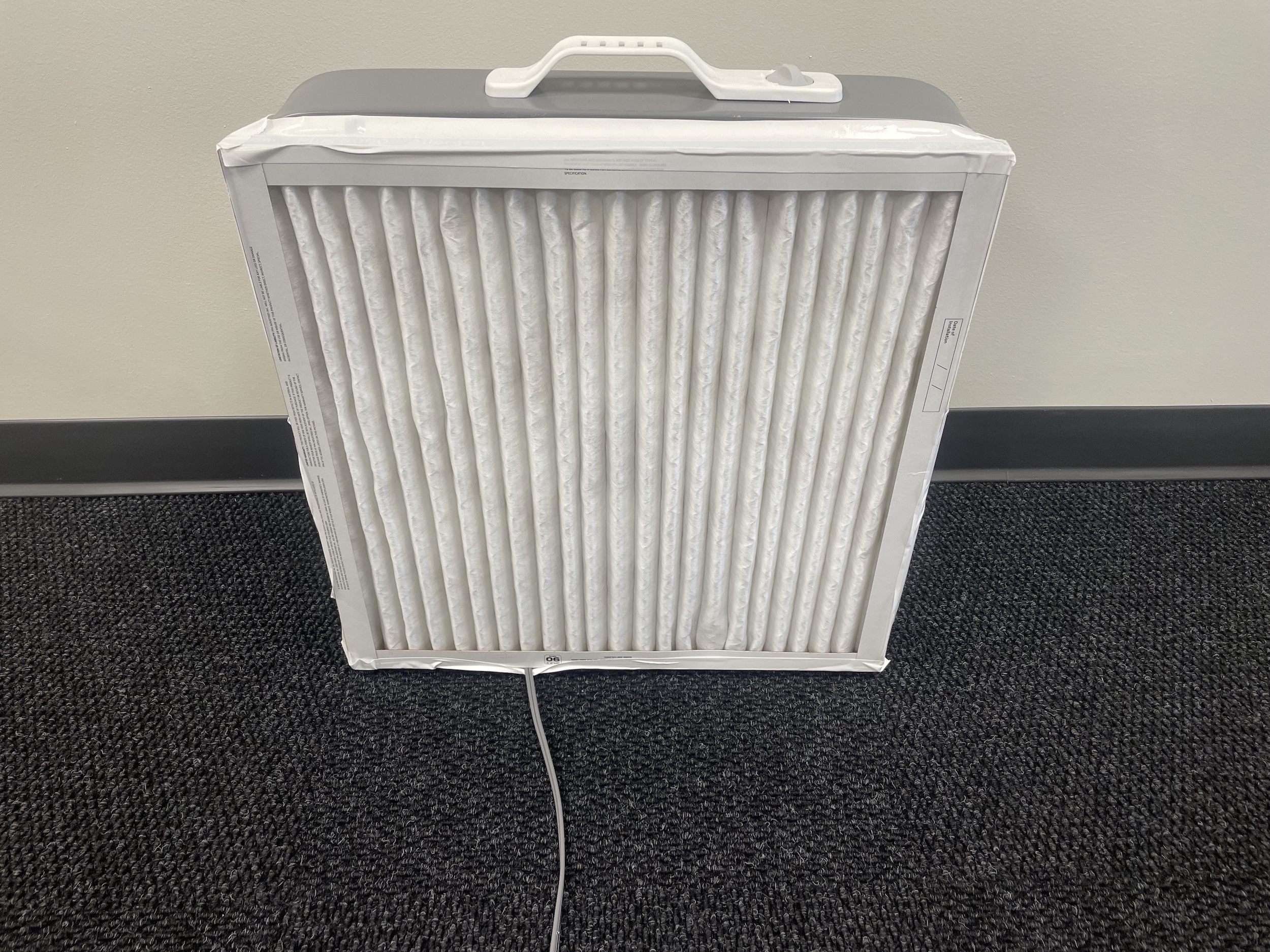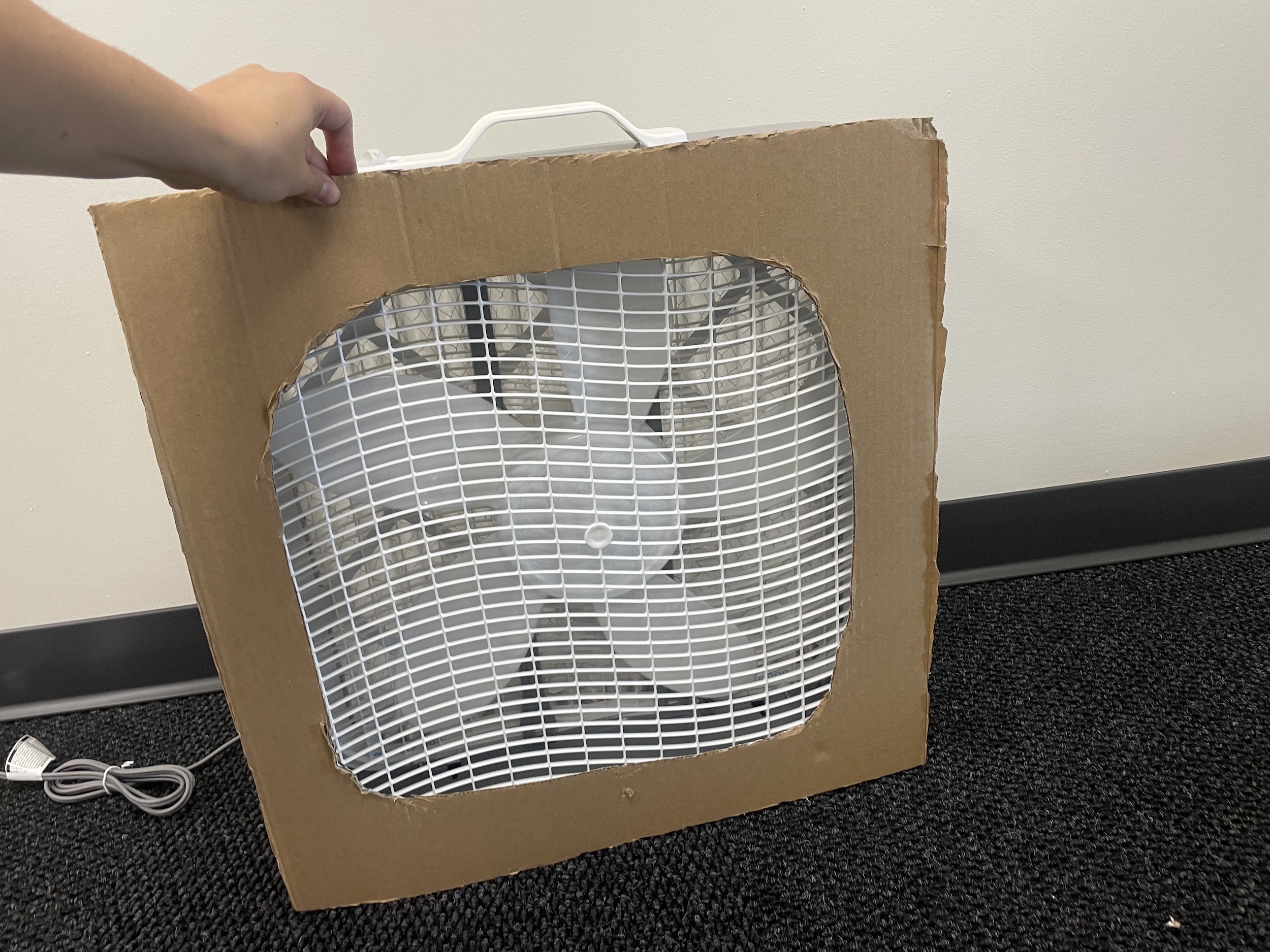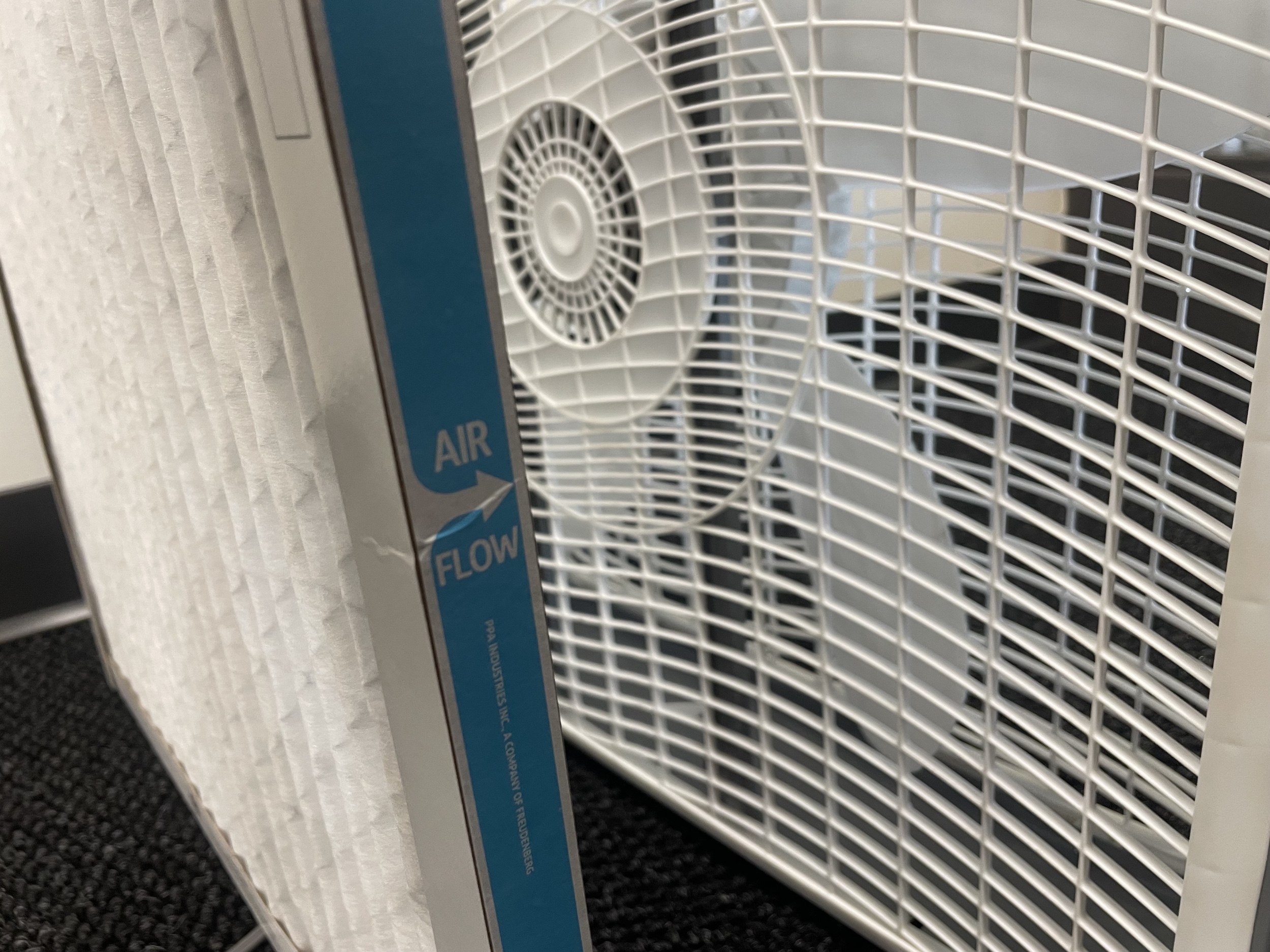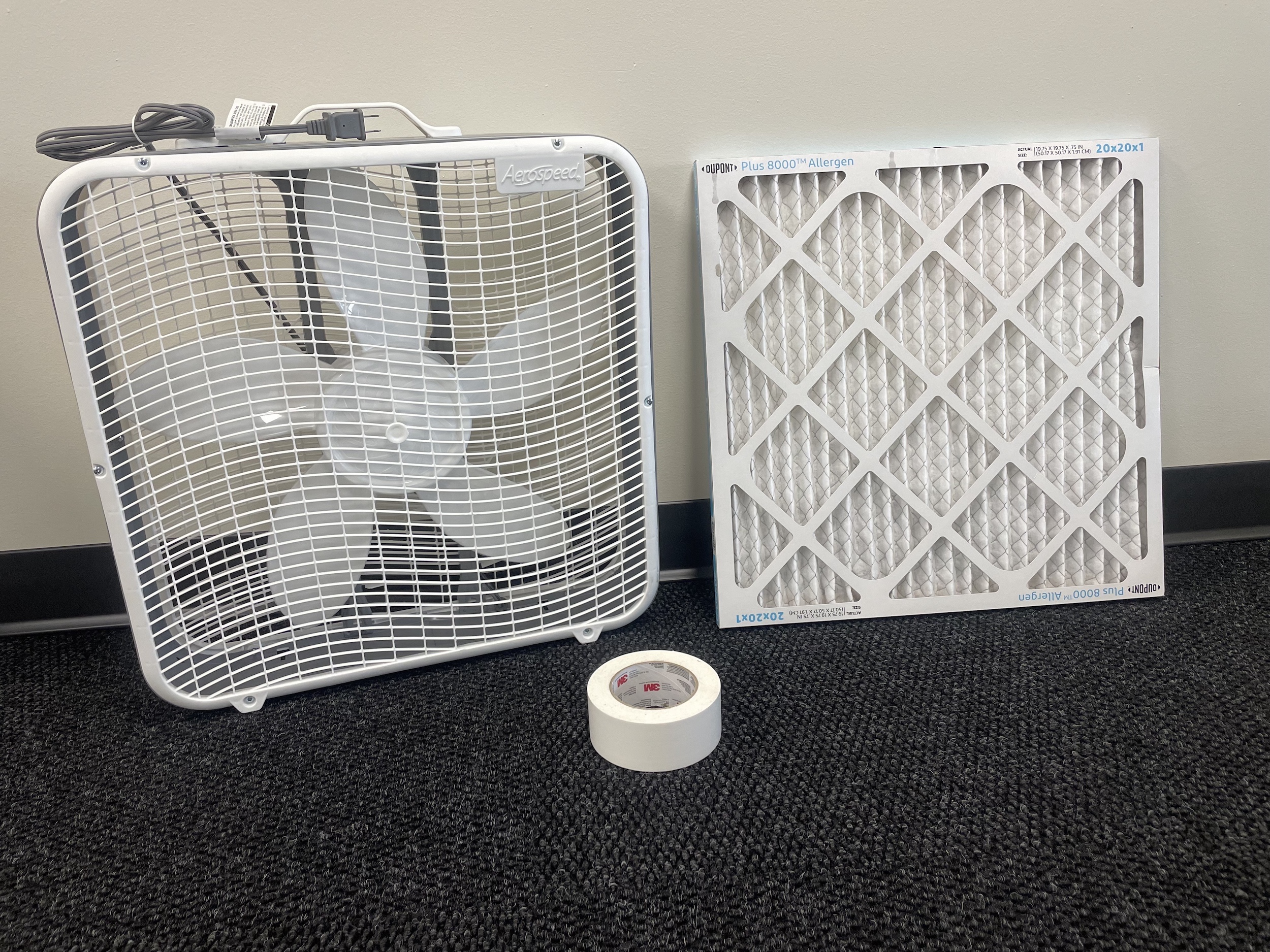 Second, it is recommended to stay indoors and limit exposure to outdoor air as much as possible. However, if you live in a residence that lacks air conditioning, or if you rely on opening the windows, there is an effective “Do It Yourself” air filter you can create with a box fan. The only other materials needed are an air filter at least 1 inch thick and wide enough to cover the box fan, and tape or clamps to secure it to the fan.