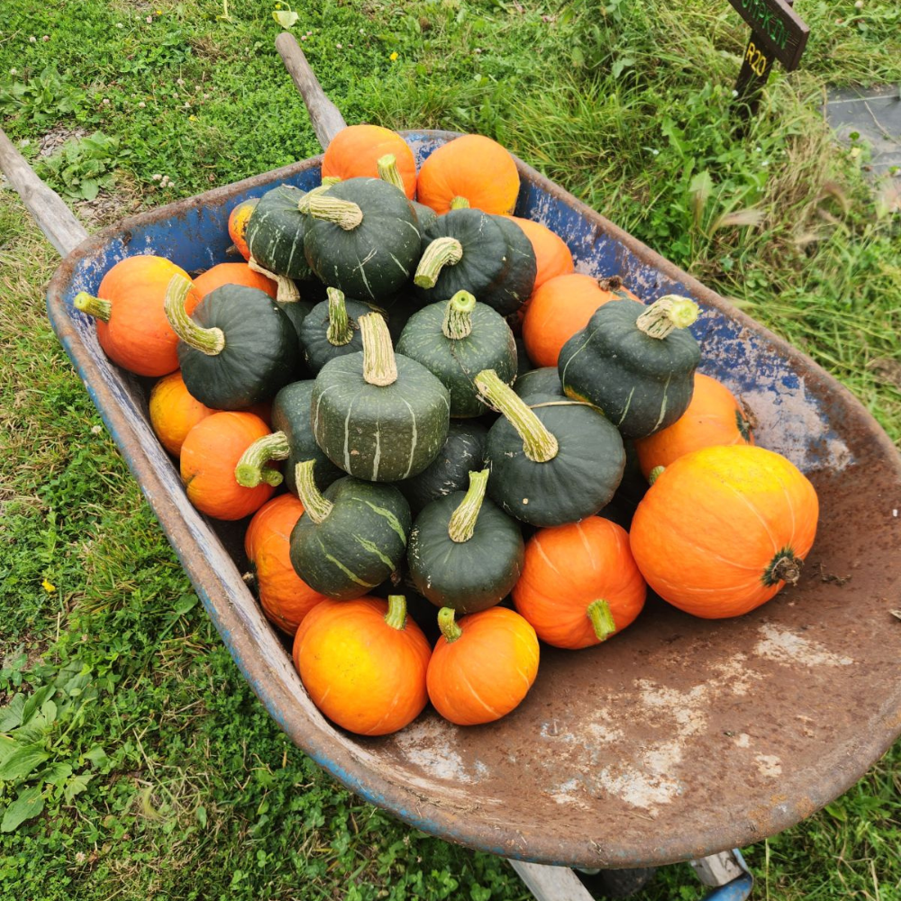 From April through October, our farm crew grew and harvested over 5100 lbs of fresh produce—literally tons of food! This volume included common staples like zucchini, tomatoes, lettuce, onions, and carrots, along with some unique, delicious offerings of kohlrabi, cucamelons, ground cherries, and more. Over 500 lbs of cucumbers flourished in our high tunnels all summer long as our most massive crop, and our selection of savory herbs, such as basil, Mexican marigold mint, and dill, were our lightest harvest with over 80 pounds grown this season.