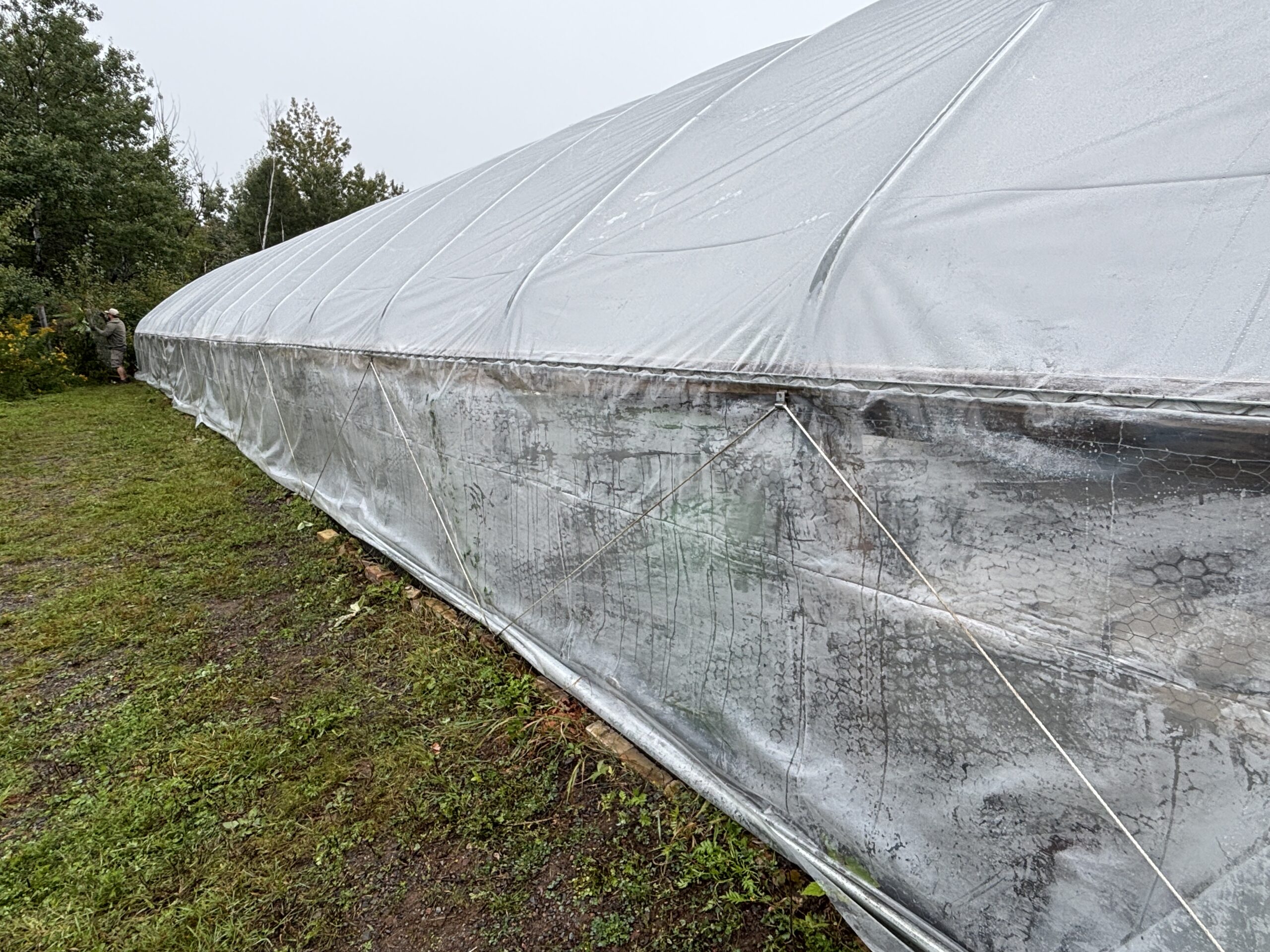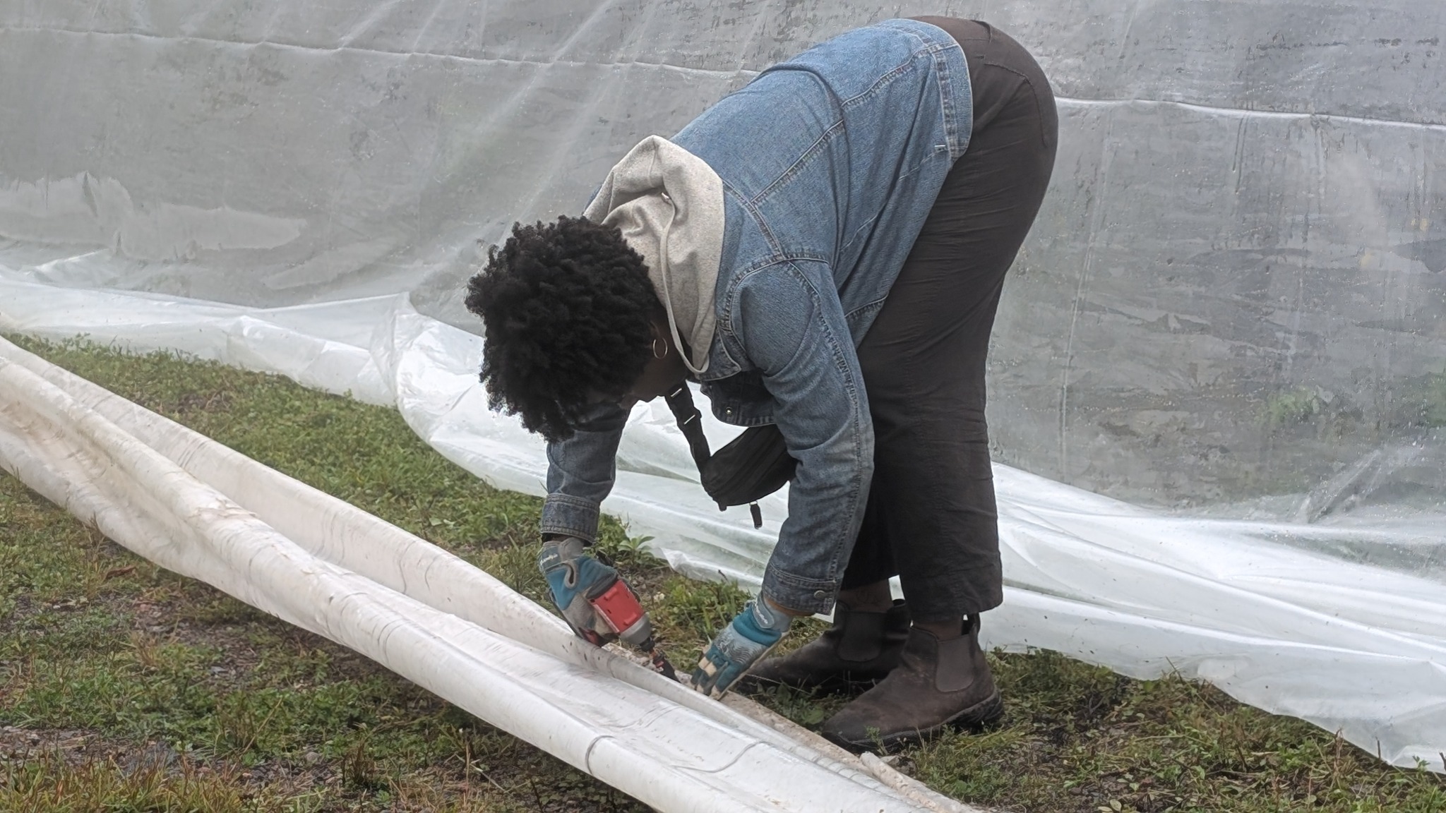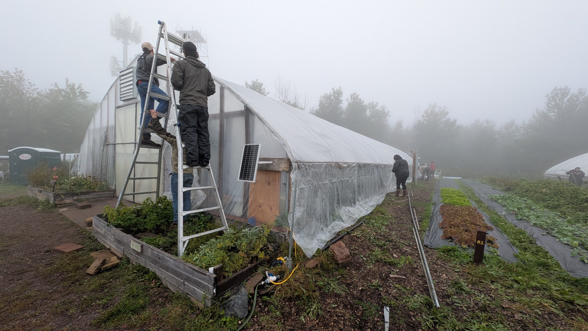 The primary project for the Day of Service was replacing the plastic on the high tunnels, which needs to be replaced every five years due to normal wear and tear. To do this, AmeriCorps Members and staff placed a 4,000+ square foot sheet of plastic over High Tunnel One, cut it to the correct length on each side, and then secured the plastic on the sides. The goal was to replace the plastic on both high tunnels; however, due to the fog and dampness that day, the conditions were not ideal to finish the project. We also had some assistance from our friends at Agate Acres Farm. Thank you to Emily and Kylie for your help and guidance on how to replace our high tunnel plastic!