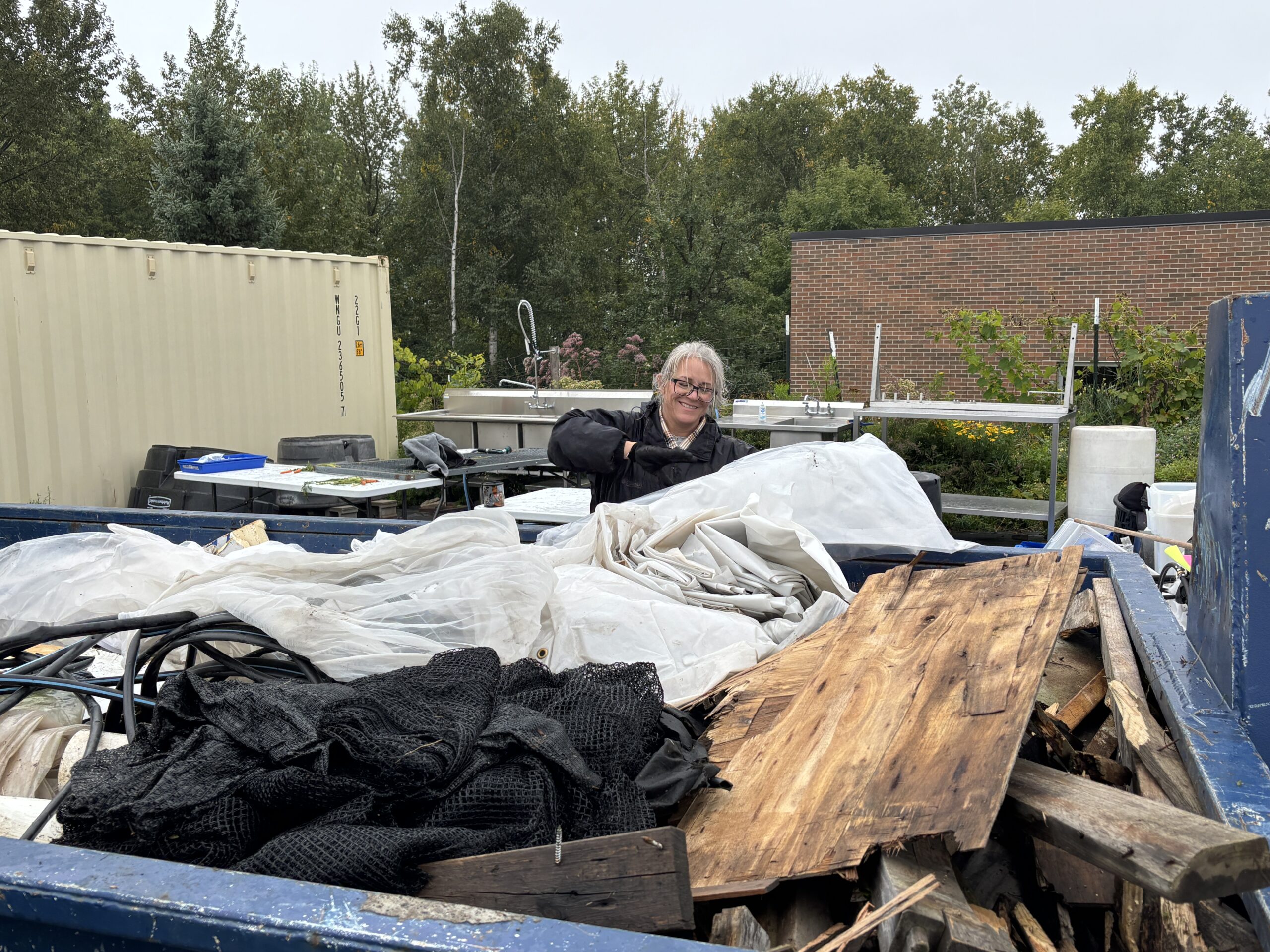 In addition to replacing the plastic on High Tunnel One, members assisted in cleaning the property and filling a dumpster with various materials that had accumulated over the years on the farm. Once the dumpster was filled, members moved on to cleaning recently harvested garlic to finish out the day.