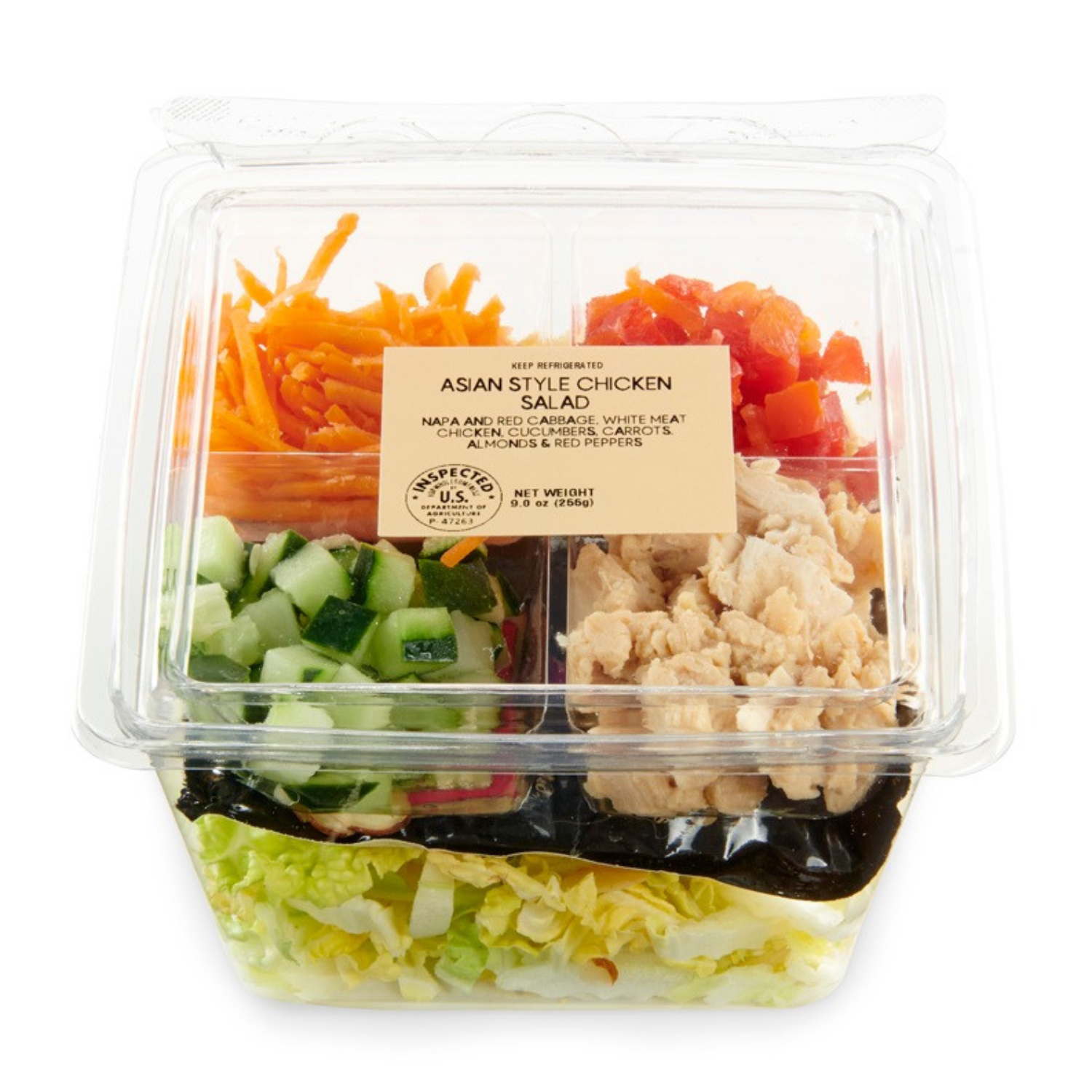 Napa cabbage, red cabbage, chicken, almonds, red pepper, cucumbers, and carrots with sesame dressing.