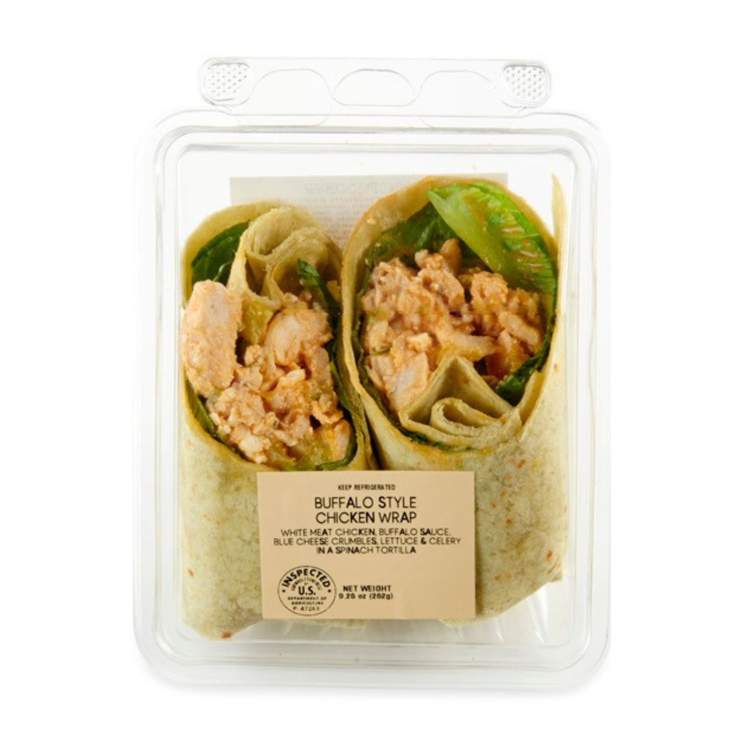 Buffalo chicken, celery, blue cheese crumbles, and lettuce in a spinach tortilla.