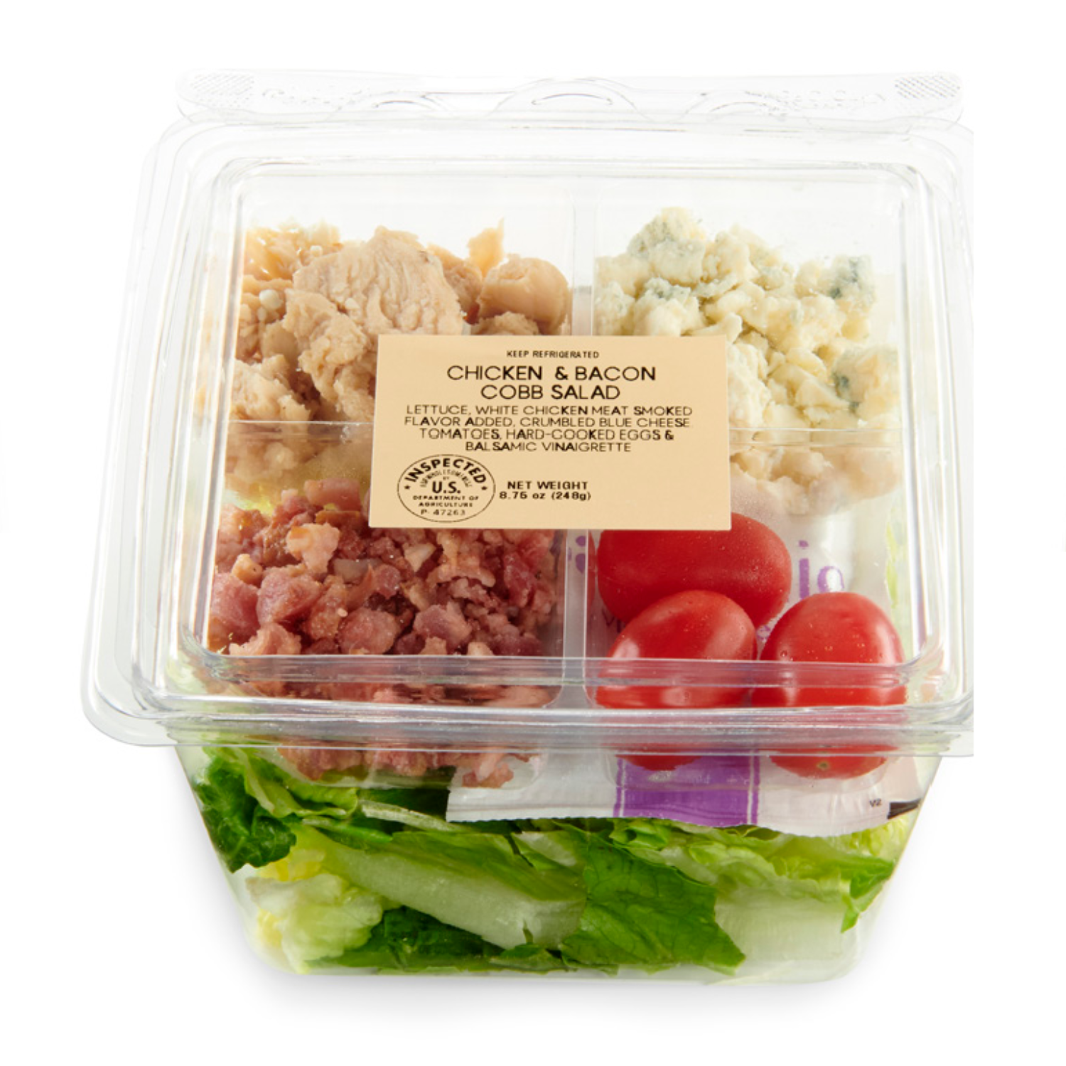 Romaine lettuce, chicken, bacon, hard-cooked egg, blue cheese crumbles, and tomato with balsamic vinaigrette.