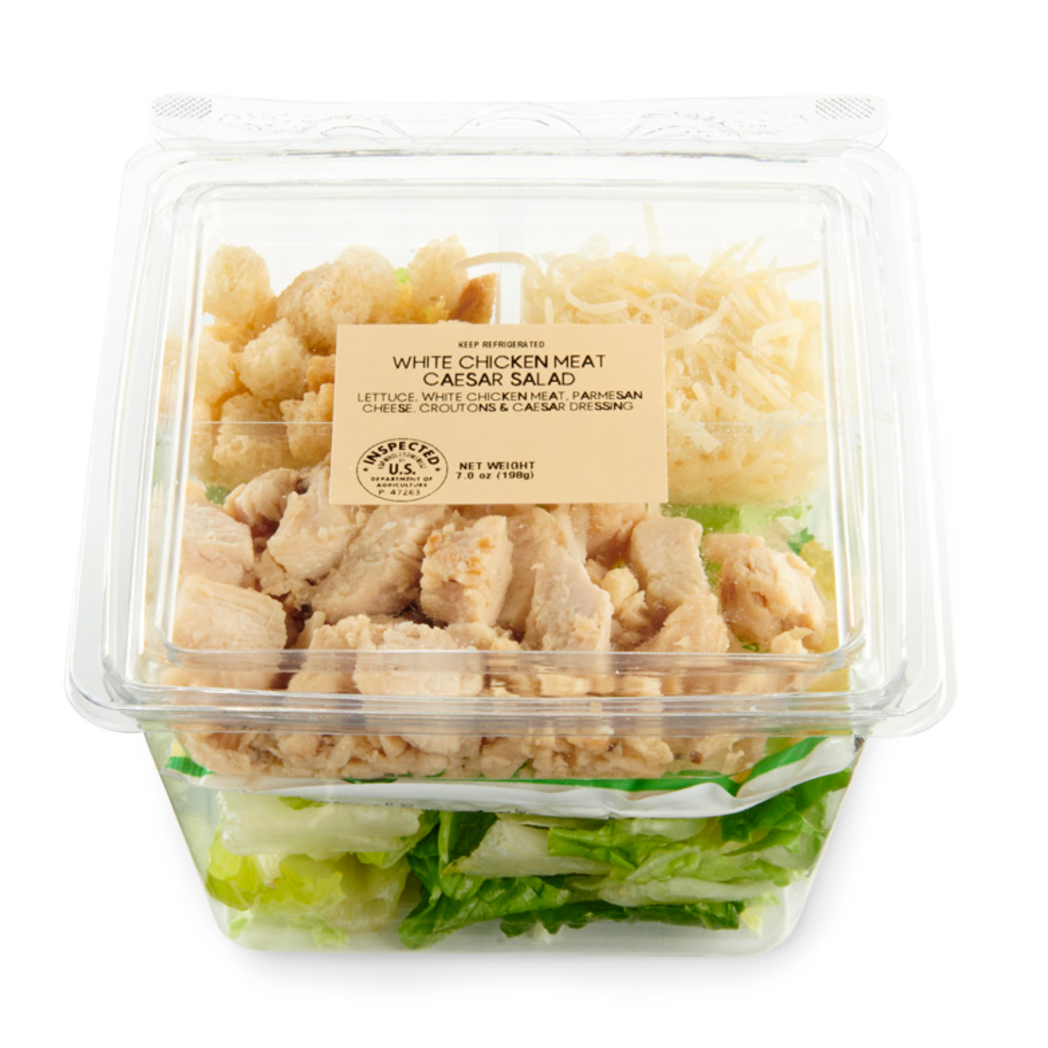 Romaine lettuce, chicken, parmesan cheese, and croutons with Caesar dressing.