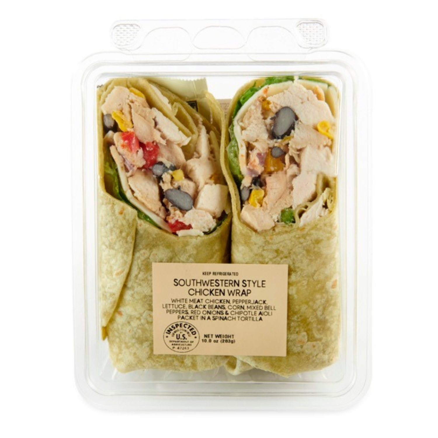 Chicken, pepper jack cheese, black beans, pepper blend, lettuce, and chipotle mayonnaise in a spinach tortilla.