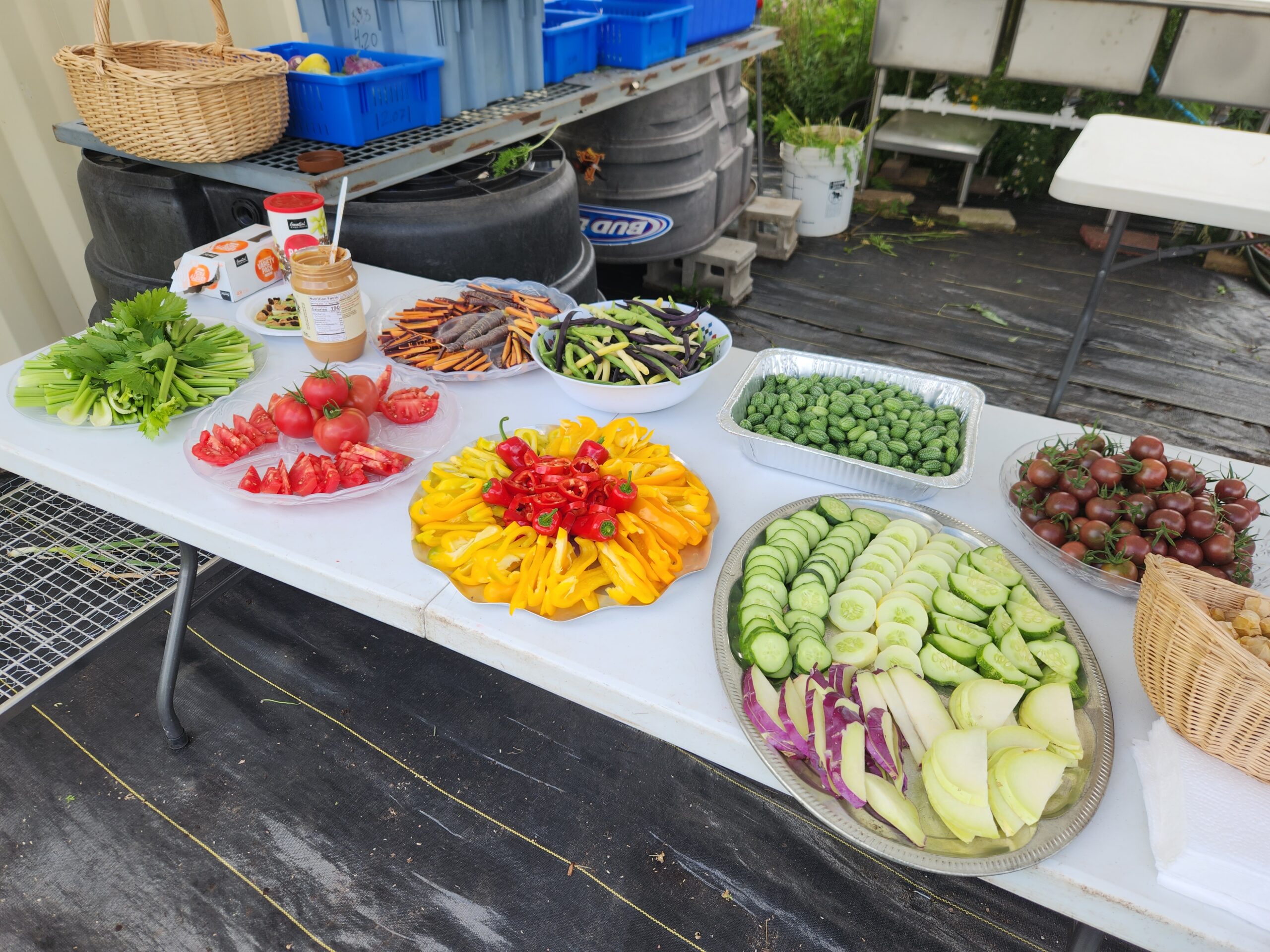 Community members came throughout the day and sampled a variety of fresh produce, including tomatoes, carrots, melons, zucchini, cucamelons, cucumbers, bell peppers, and more. Folks were also able to feast on a lunch courtesy of ingredients from the Eco3 Farm. The menu included pesto pasta with zucchini noodles, collard greens and red onion stew, and tabouli salad.